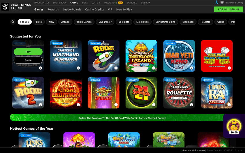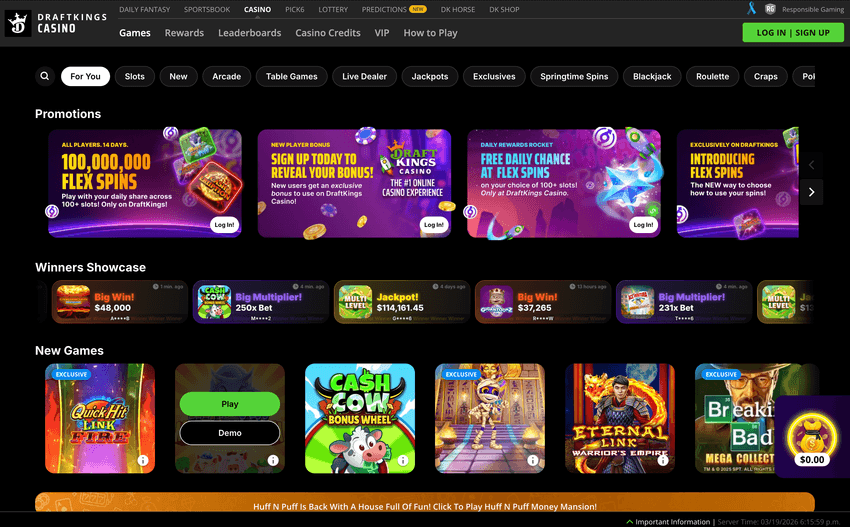 Game Providers | NetEnt, IGT, Evolution Gaming, Big Time Gaming, Everi, plus DraftKings’ own exclusives, some Microgaming titles, NextGen |
